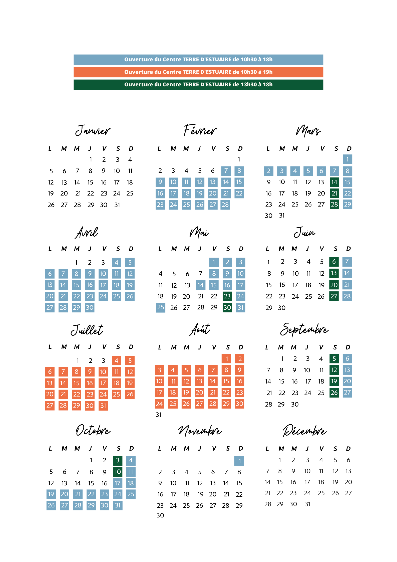 Le Centre Terre d’Estuaire est ouvert de 13h30 à 18h le samedi et de 10h30 à 18h le dimanche. Pendant les vacances scolaires (toutes zones), nous sommes ouverts 7 j/7 de 10h30 à 18h (19h l’été), ainsi que les jours fériés.